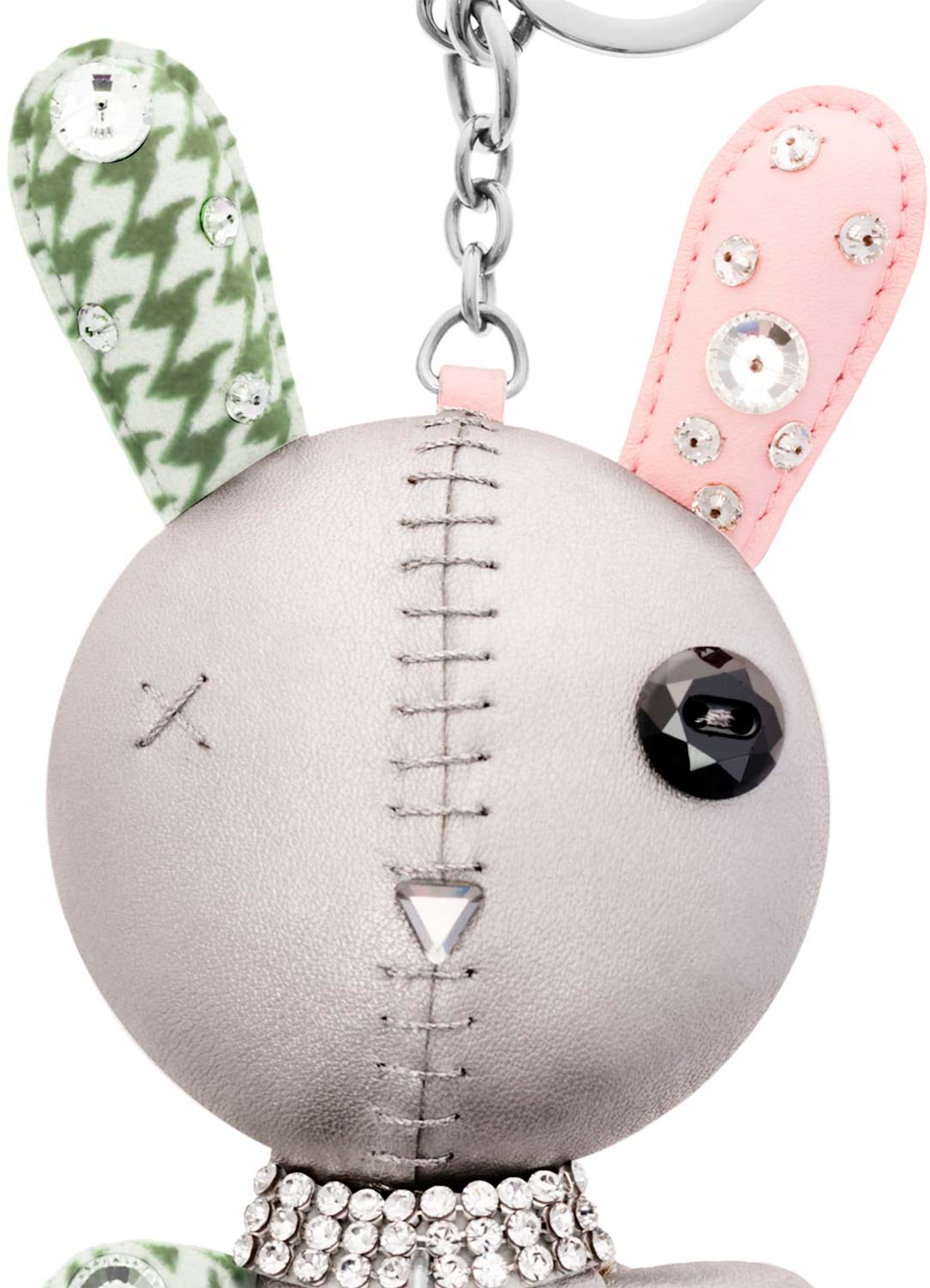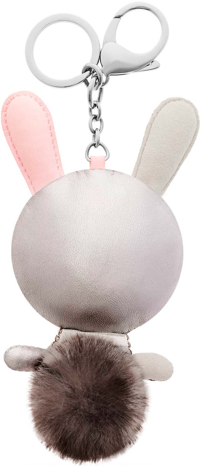 Очаровательный кролик из телячьей кожи и алькантары, украшенный кристаллами, ожерельем и искусственным мехом.