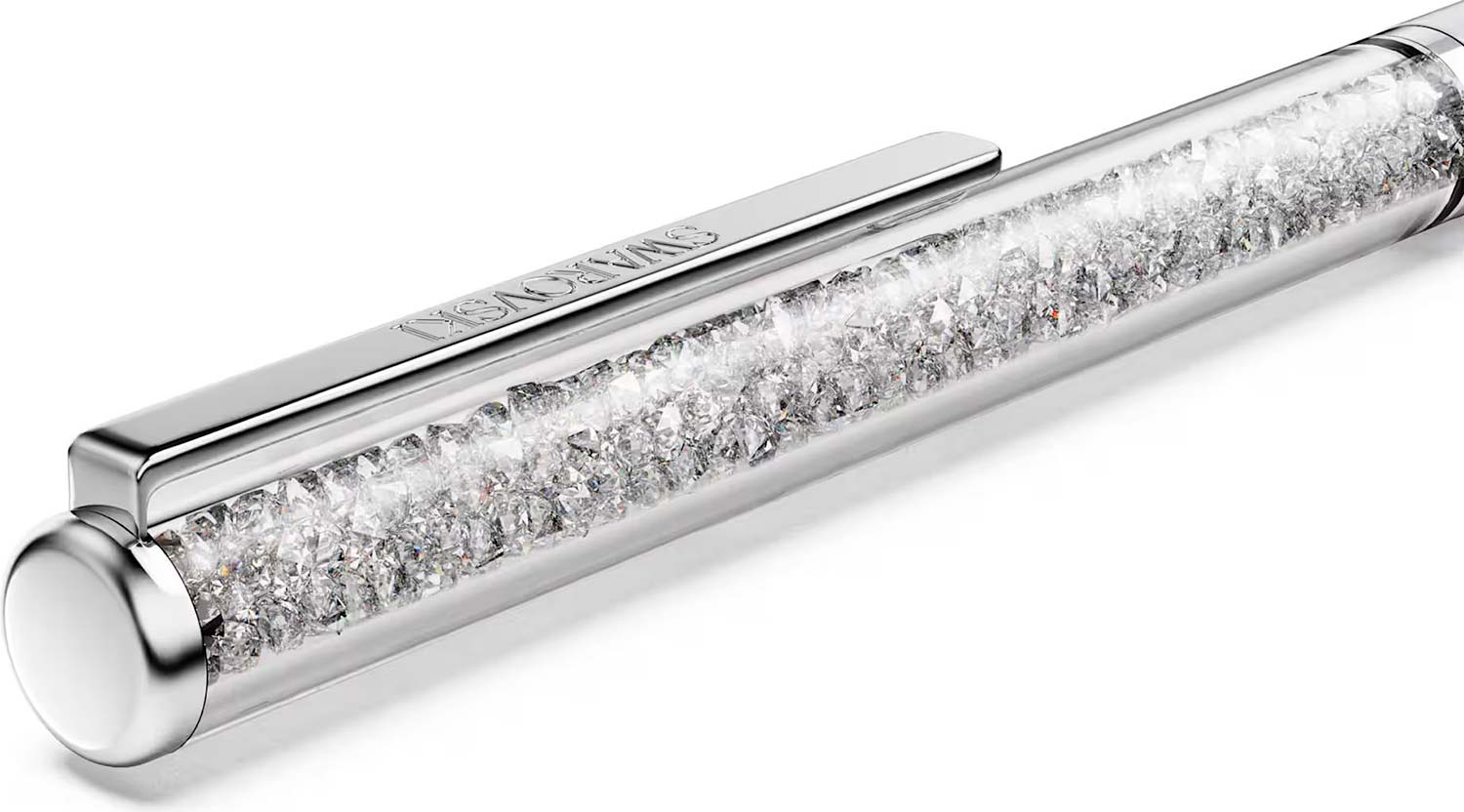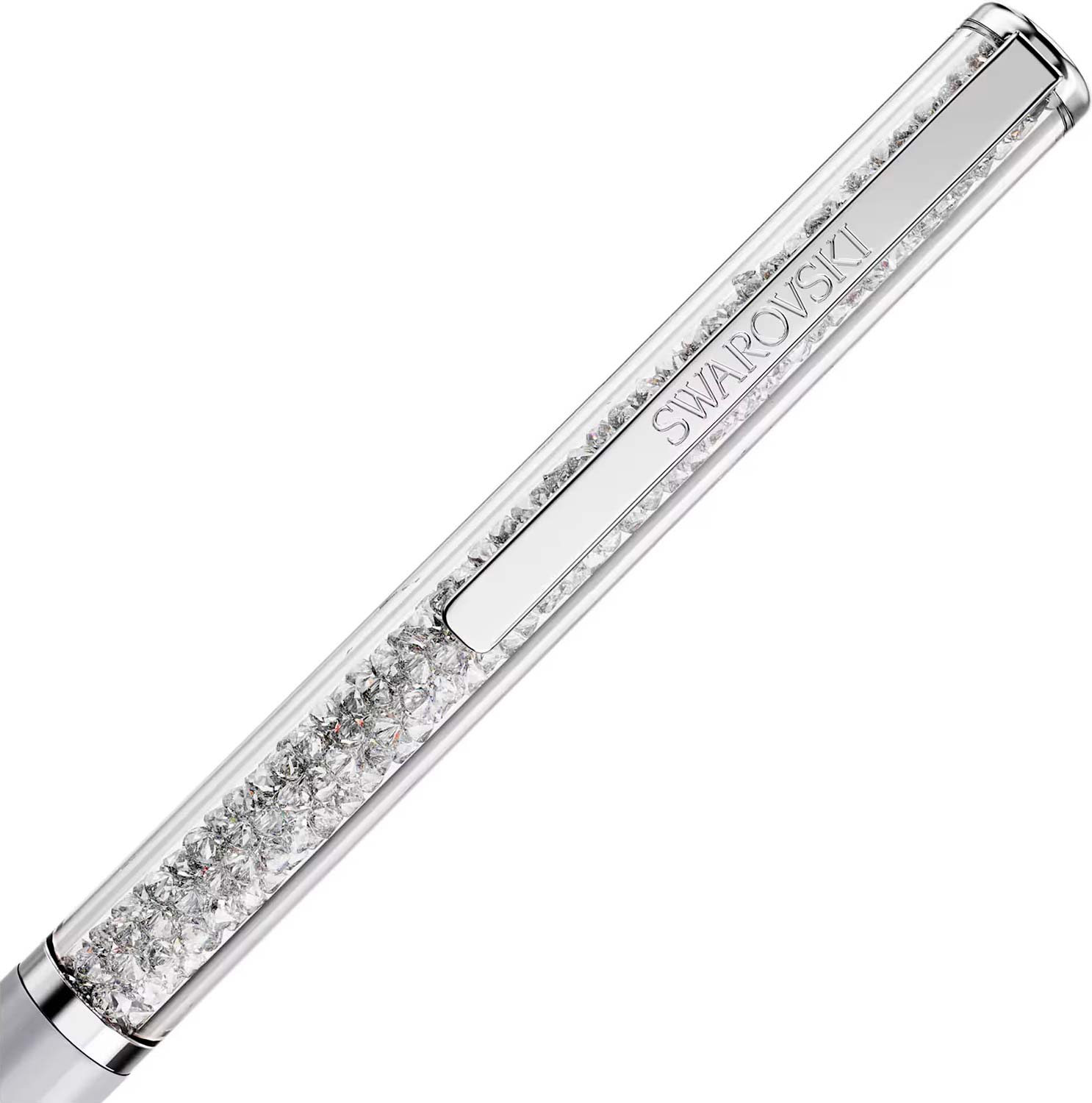 Шариковая ручка. Изящная шариковая ручка Crystalline Silk - неподвластный времени аксессуар для тех, кто ценит качество и стиль. Тонкий лакированный серебристый корпус ручки украшен примерно 400 прозрачными кристаллами, которые можно рассмотреть через длинное прозрачное окошко. Ручка оснащена хромированной клипсой с логотипом Swarovski. Цвет чернил - черный.