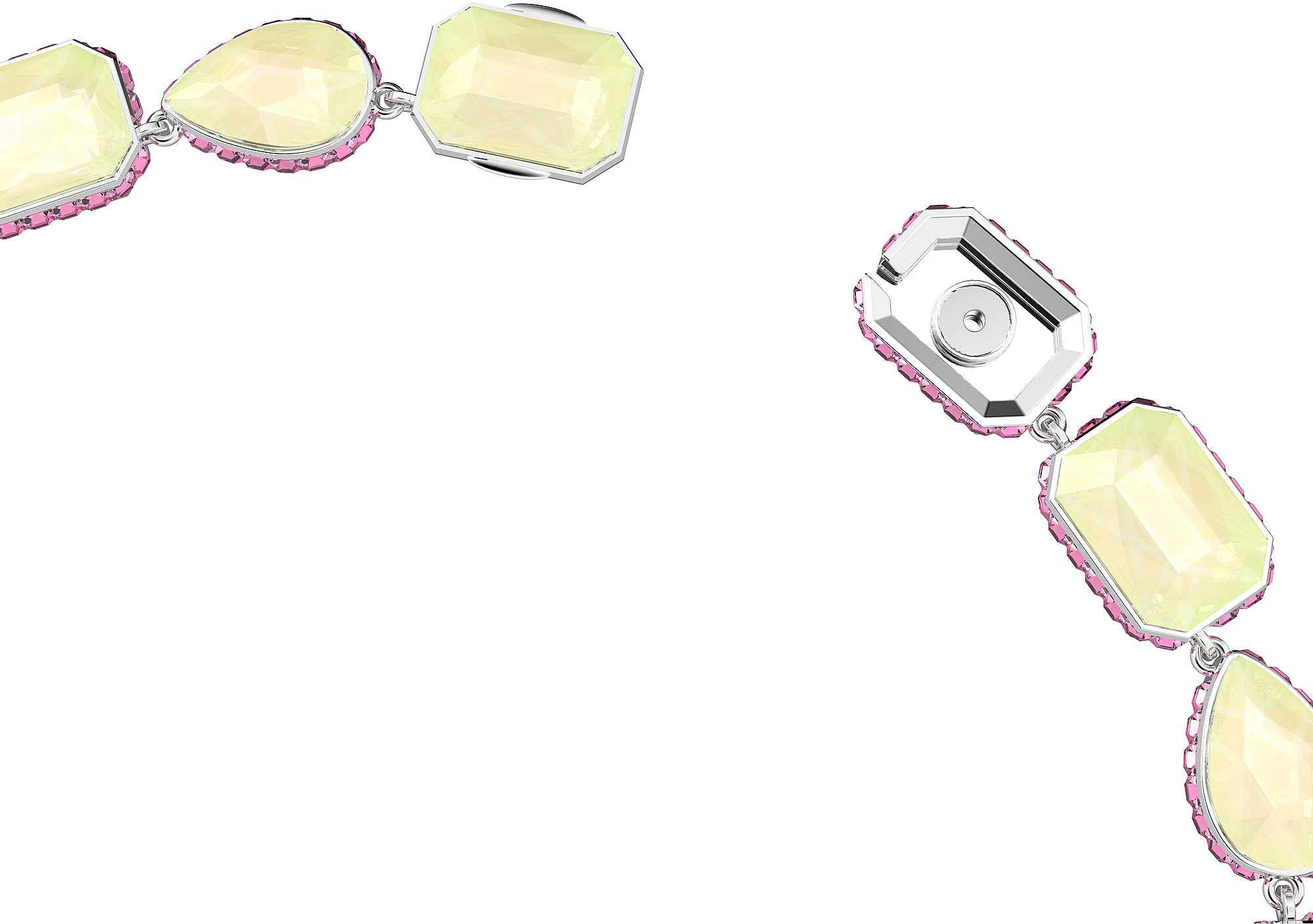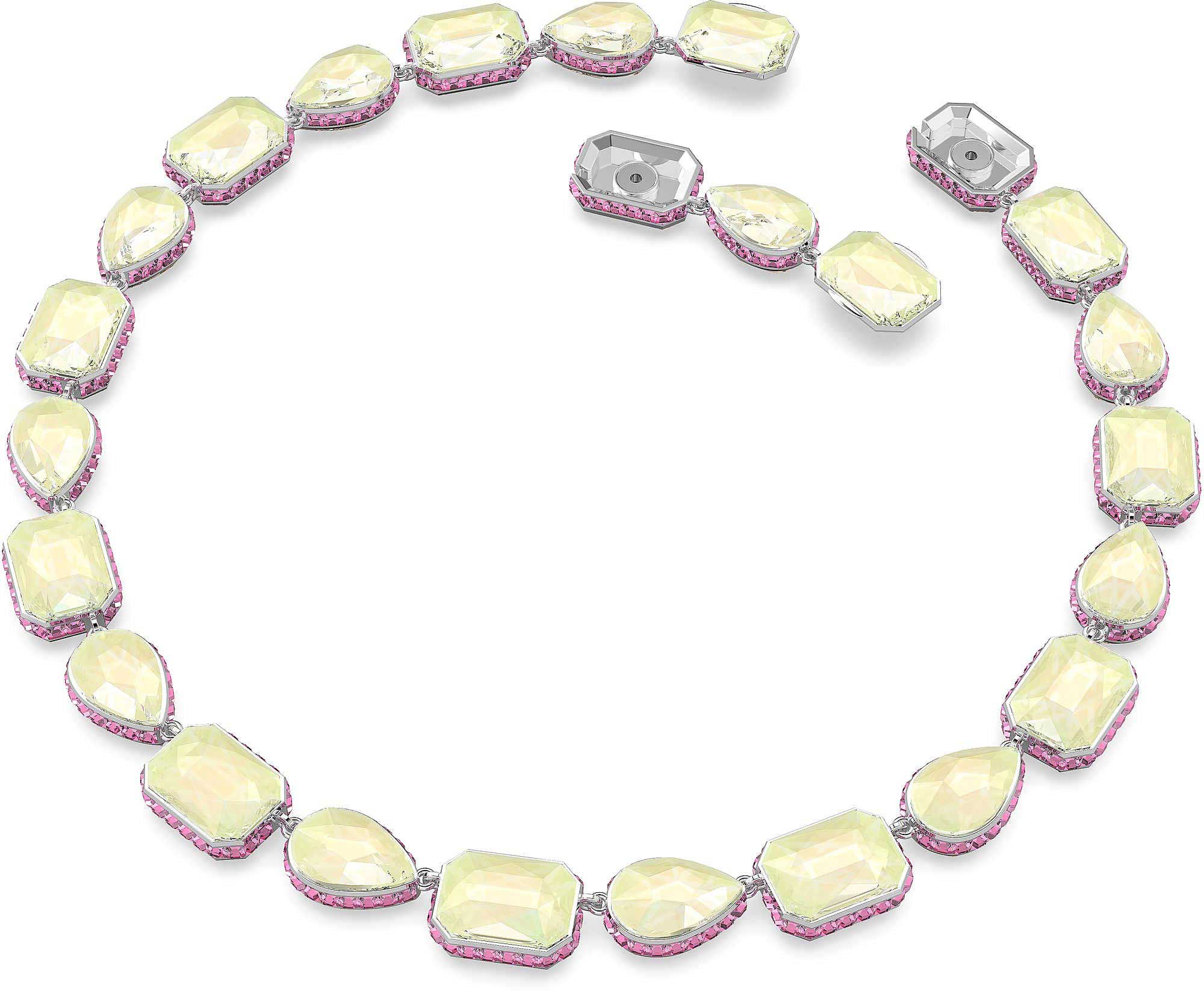 Крупное ожерелье из коллекции Orbita, выполненное из металла, украшенное крупными желтыми кристаллами Swarovski каплевидной и прямоугольной формы, каждый из которых обрамлен паве из мелких розовых кристаллов Swarovski.