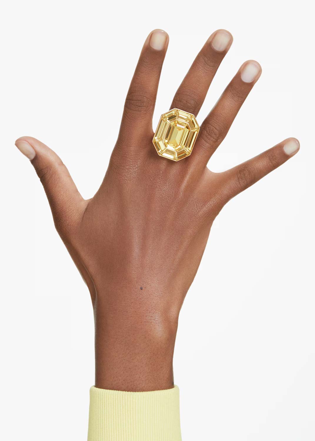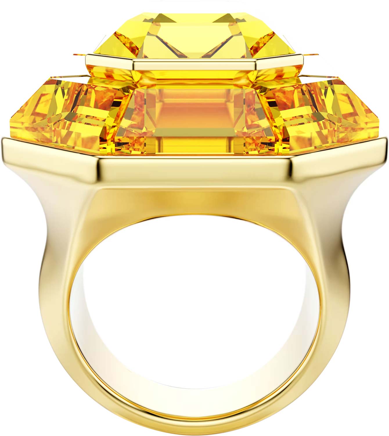 Яркое коктейльное кольцо из коллекции Lucent с крупным культовым восьмиугольным кристаллом Swarovski в позолоченной оправе.