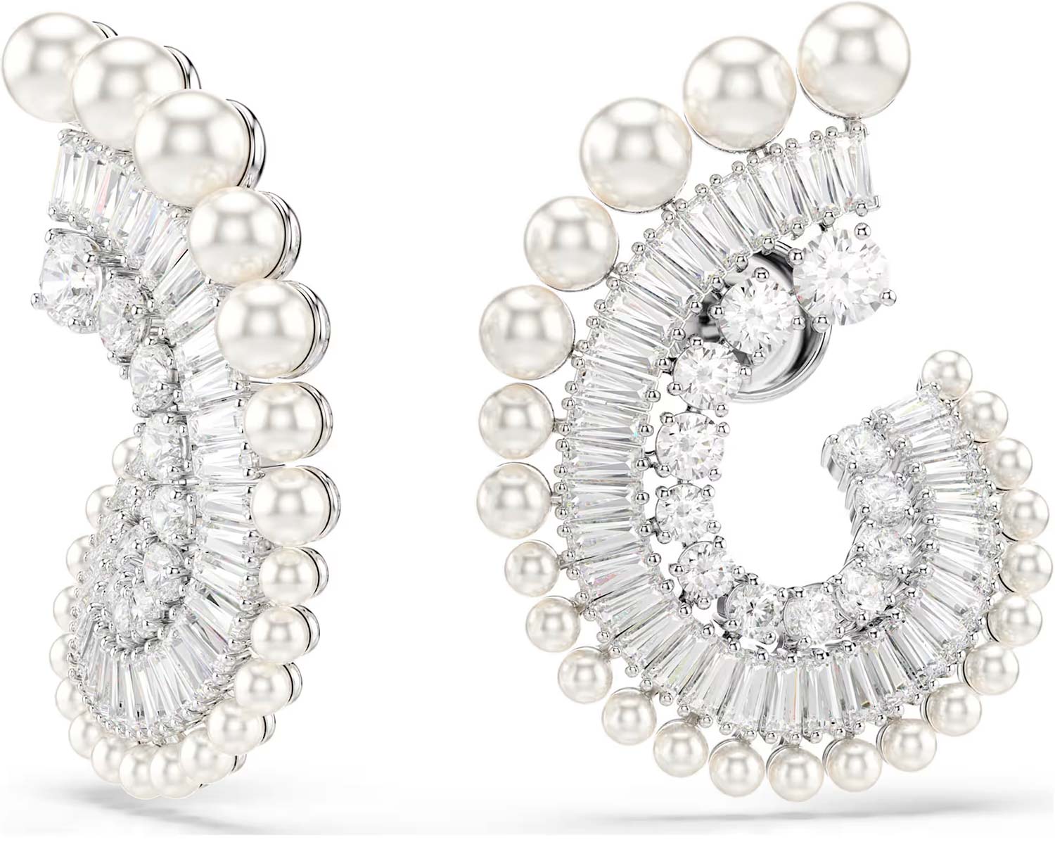Изысканные серьги из коллекции Ariana Grande x Swarovski станут стильным акцентом любого наряда. Каждое изделие, покрытое родием, представляет собой открытую спираль, украшенную кристаллами Swarovski круглой и багетной огранок. Размеры камней постепенно увеличиваются, создавая градиентный эффект. Внешняя часть сережек дополнена рядом хрустальных жемчужин Swarovski, которые придают серьгам роскошный и чарующий вид. Штифтовый замок.